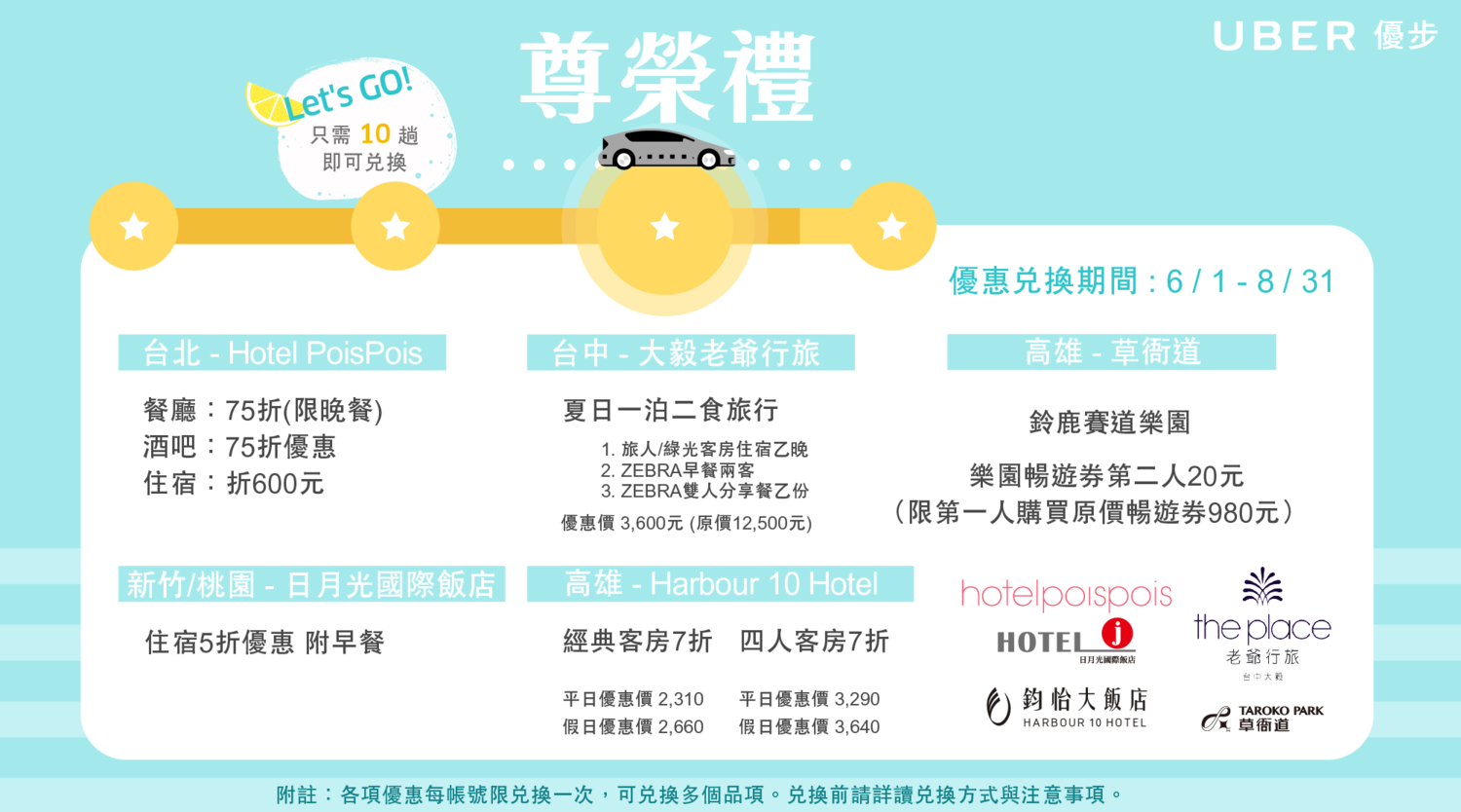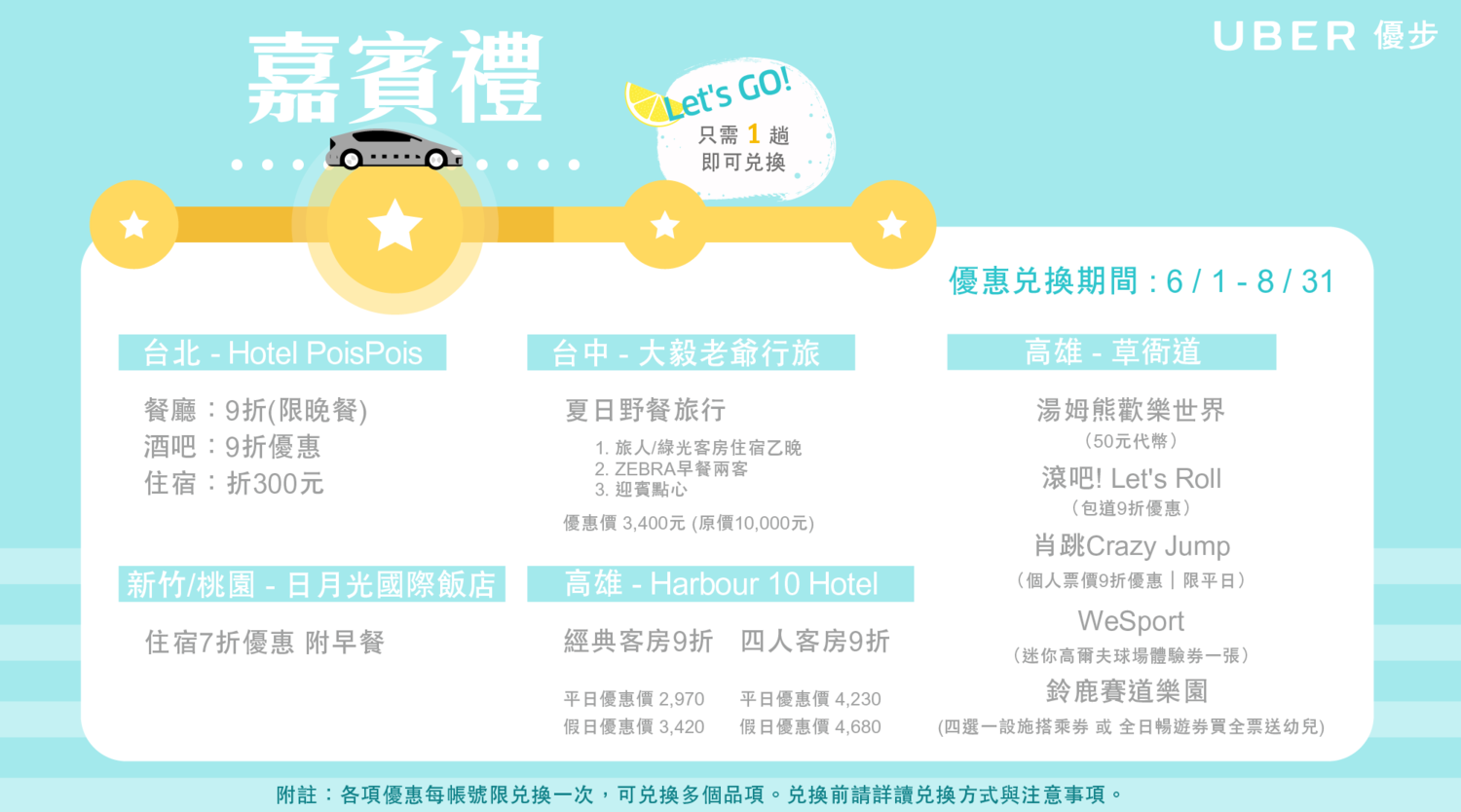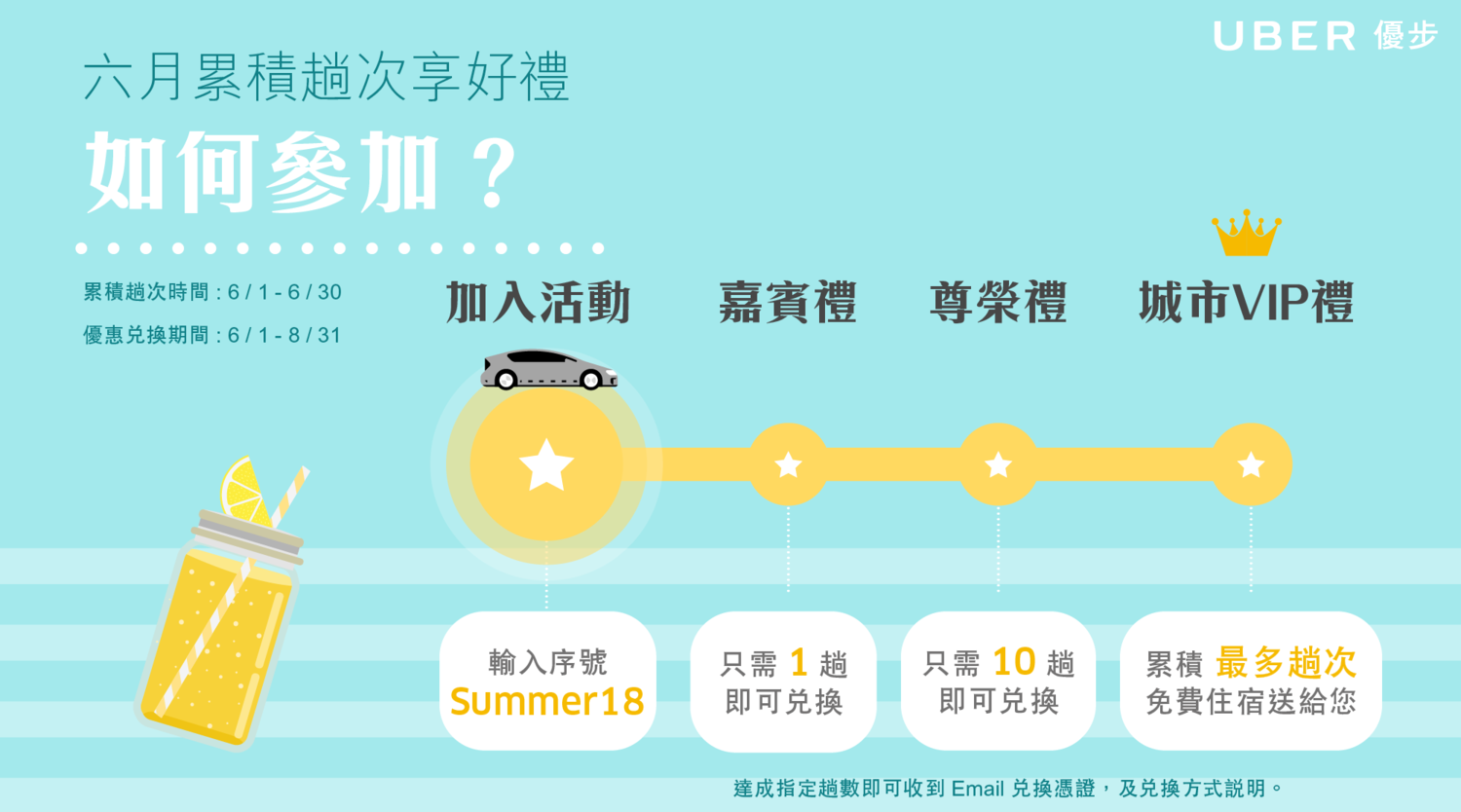 即可參加夏季優旅行 趟次累積活動於 6/1 – 6/30 搭乘 Uber 完成指定趟次,