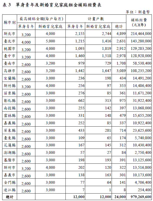 今年9月起,只能符合條件的單身青年可申請每月租金補助新台幣2600元到4000元,婚育家庭則為3000元到5000元。