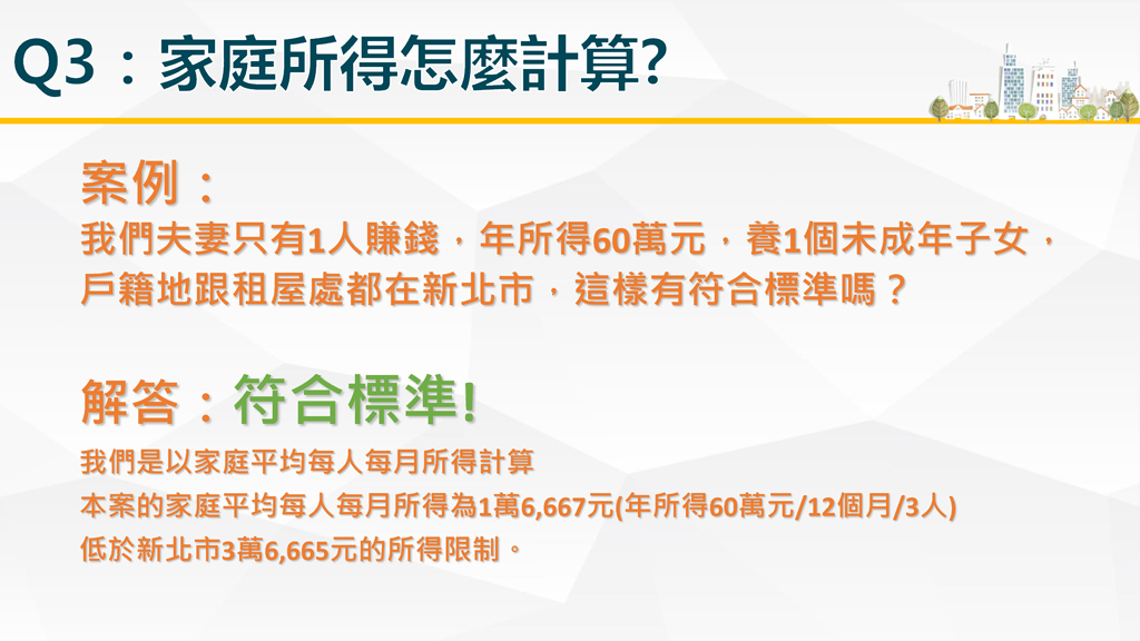 每人每月平均所得低於最低生活費2.5倍以下(請見下表)且無自有住宅之2年內新婚或育有未成年子女(含胎兒)家庭。