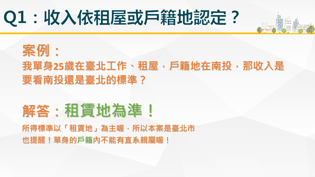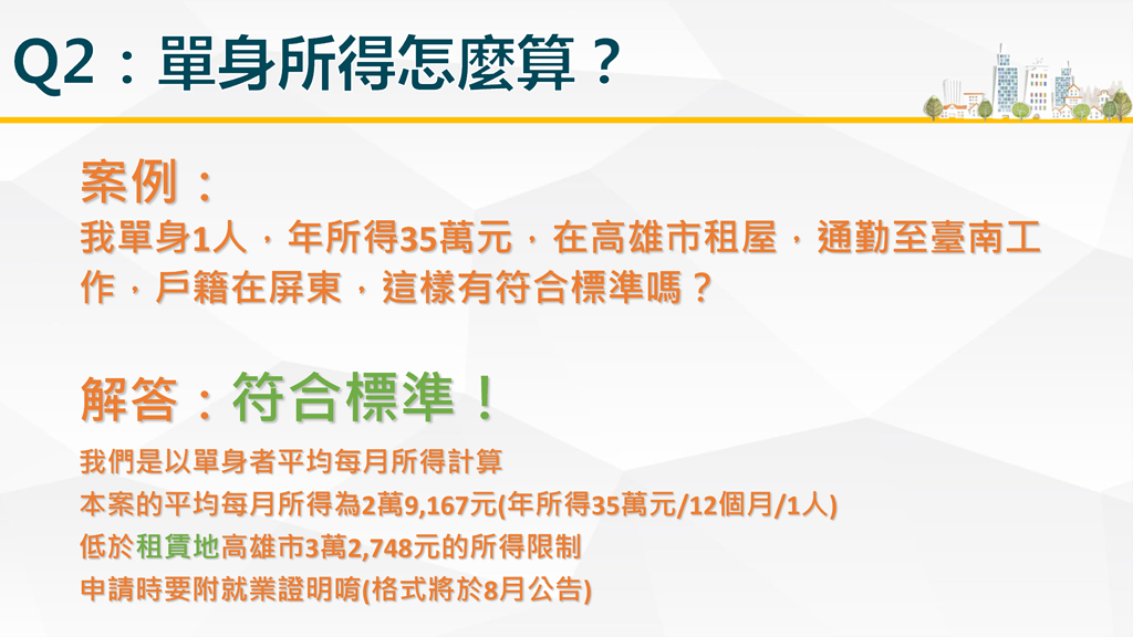 含「租屋處與戶籍不在同一直轄市、(縣)市」就業租屋青年,且年齡在 20歲至40歲、每月平均所得低於最低生活費2.5倍以下(請見下表)且無自有住宅之未婚、離婚或喪偶者。