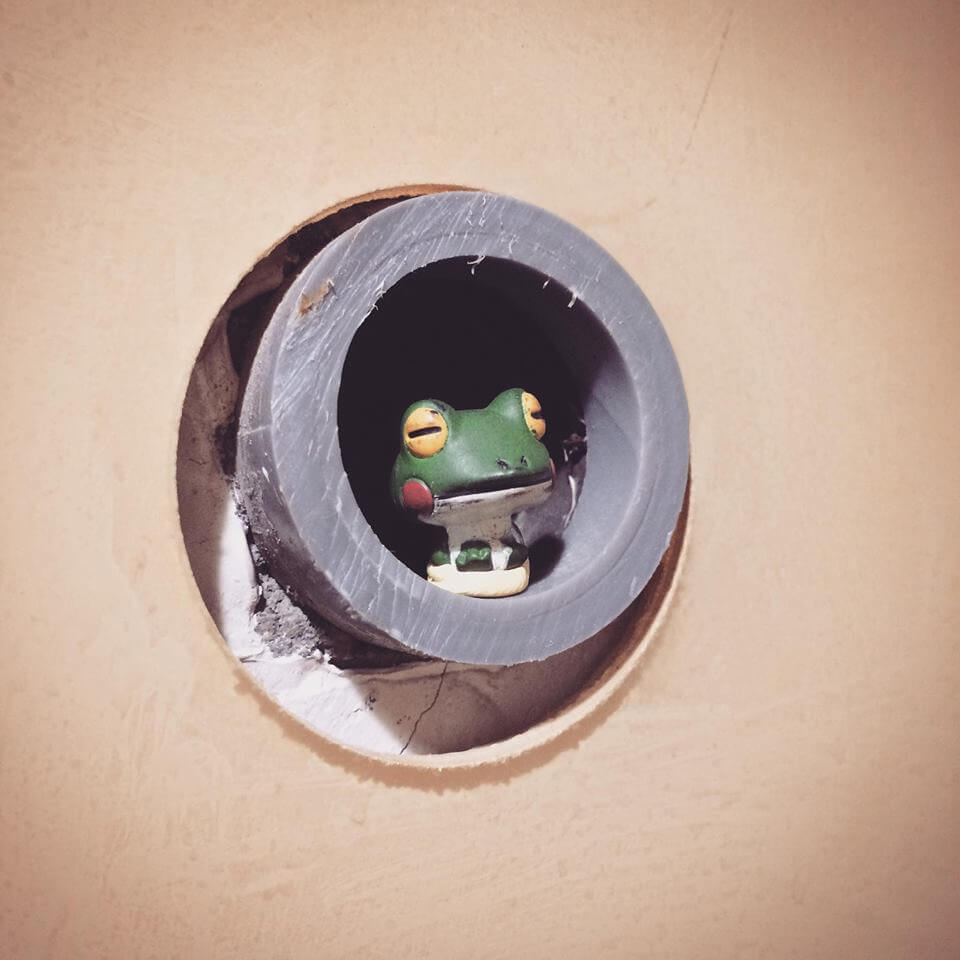 這是公司小便斗對面的牆面,當初裝修時沒有處理好的水管孔,被我用萬能黏土將一隻小青蛙公仔固定上去,講好聽一點就是美化環境,實際是一個偷窺小便的小青蛙,有趣的是裝置了一季都還沒有人發現,看來家裡擺不下的公仔有地方可以放了 XD